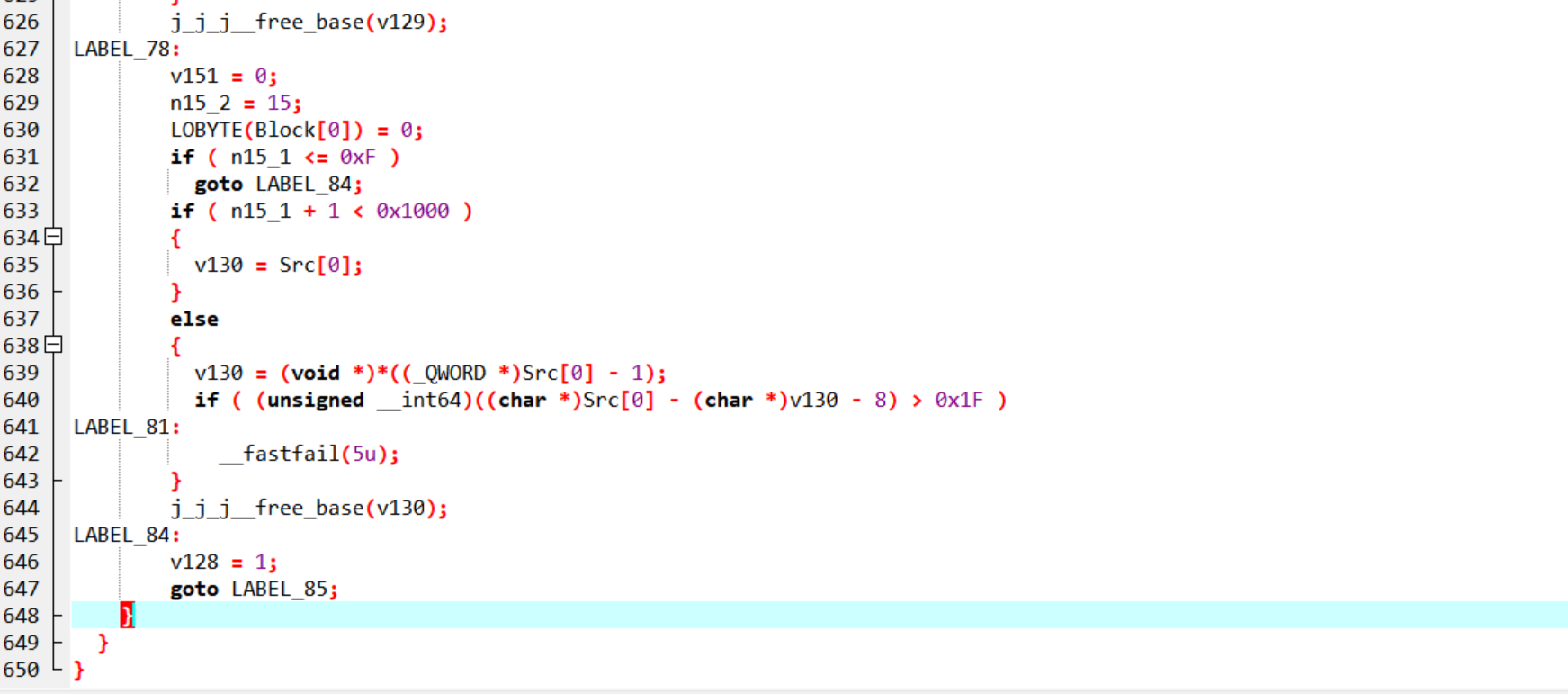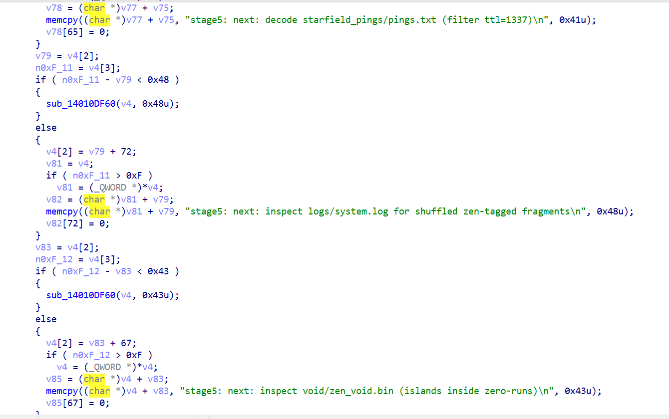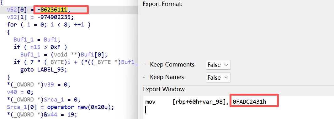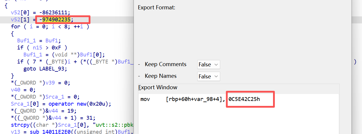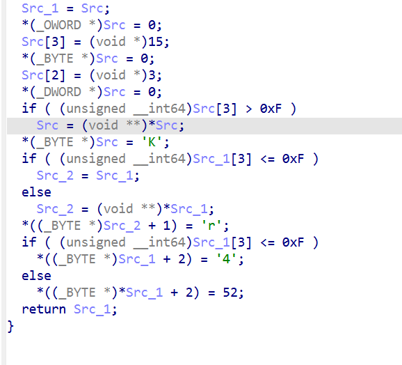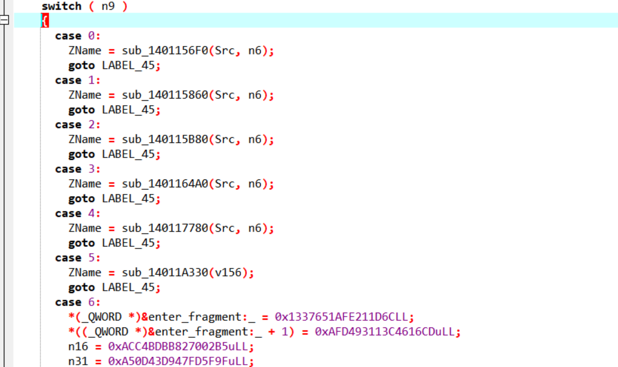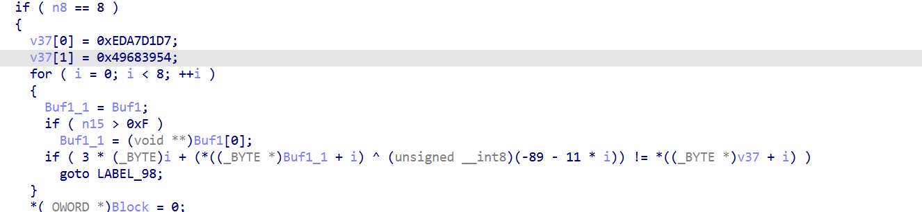 描述 --  首先看到这里的描述就应该知道他有很多块去拼接成一个flag 一、程序整体结构 -------- 首先用die查看是否有壳顺便看看结构,就会得到一个无壳的exe程序,既然没有壳那就直接扔到ida去看看反编译后的代码就行  会逆向的都应该知道直接进去找main(入口)函数就行  完整代码如下: ```php int __fastcall main(int argc, const char **argv, const char **envp) { void *v3; // rax _QWORD *v4; // rax int n9; // r13d __m128i si128; // xmm6 __m128i v7; // xmm9 __m128i v8; // xmm8 __m128i v9; // xmm7 __m128i v10; // xmm10 __m128i v11; // xmm11 __m128i v12; // xmm12 char ZName; // bl signed int n32; // ecx signed int n4; // edx signed int n8; // r8d signed int n12; // r9d int i; // r8d signed int n32_1; // ecx signed int n4_1; // edx signed int n8_1; // r8d signed int n12_1; // r9d int j; // r8d signed int n32_2; // ecx signed int n4_2; // edx signed int n8_2; // r8d signed int n12_2; // r9d int k; // r8d signed int n32_3; // ecx signed int n4_3; // edx signed int n8_3; // r8d signed int n12_3; // r9d int m; // eax void *enter_fragment:__1; // rcx void **v119; // rdx size_t Size_1; // rdi void **Src_1; // r9 __int64 v122; // rsi void **v123; // rbx __int64 v124; // rax __int64 v125; // rax void *v126; // rcx void *v127; // rcx unsigned __int8 v128; // bl void *v129; // rcx void *v130; // rcx void **v131; // rdx __int64 v132; // rax void *v133; // rcx __m128i v135; // [rsp+30h] [rbp-1F8h] BYREF __m128i v136; // [rsp+40h] [rbp-1E8h] __m128i v137; // [rsp+50h] [rbp-1D8h] __m128i v138; // [rsp+60h] [rbp-1C8h] __m128i v139; // [rsp+70h] [rbp-1B8h] __m128i v140; // [rsp+80h] [rbp-1A8h] __m128i v141; // [rsp+90h] [rbp-198h] __m128i v142; // [rsp+A0h] [rbp-188h] __int128 enter_fragment:_; // [rsp+B0h] [rbp-178h] BYREF unsigned __int64 n16; // [rsp+C0h] [rbp-168h] unsigned __int64 n31; // [rsp+C8h] [rbp-160h] _BYTE v146[32]; // [rsp+D0h] [rbp-158h] BYREF void *Src[2]; // [rsp+F0h] [rbp-138h] BYREF size_t Size; // [rsp+100h] [rbp-128h] unsigned __int64 n15_1; // [rsp+108h] [rbp-120h] void *Block[2]; // [rsp+110h] [rbp-118h] BYREF __int64 v151; // [rsp+120h] [rbp-108h] unsigned __int64 n15_2; // [rsp+128h] [rbp-100h] void *v153[2]; // [rsp+130h] [rbp-F8h] BYREF __int64 v154; // [rsp+140h] [rbp-E8h] unsigned __int64 n15; // [rsp+148h] [rbp-E0h] _QWORD v156[4]; // [rsp+150h] [rbp-D8h] BYREF v135.m128i_i64[0] = (__int64)"uvt_crackme_work"; sub_14010CF90(v146); v3 = (void *)sub_140111FA0(Src); sub_14010FFC0(v156, v3); sub_140111980(Src); sub_140111980(v146); v135.m128i_i32[0] = 0; v135.m128i_i64[1] = (__int64)&off_140433020; sub_140111C90(v156, &v135); if ( v135.m128i_i32[0] ) sub_140111830("create_directories", &v135, v156); v135.m128i_i64[0] = (__int64)"progress.json"; v135.m128i_i64[1] = 13; sub_14010CF90(Block); v4 = (_QWORD *)sub_14010FFC0(&enter_fragment:_, v156); if ( v4[3] > 7u ) v4 = (_QWORD *)*v4; sub_1402DD7A4(v4); sub_140111980(&enter_fragment:_); sub_140111980(Block); *(_OWORD *)v153 = 0; v154 = 0; n15 = 15; LOBYTE(v153[0]) = 0; n9 = 0; sub_140113690(0, v156); si128 = _mm_load_si128((const __m128i *)&xmmword_14030D700); v7 = _mm_load_si128((const __m128i *)&xmmword_14030D780); v8 = _mm_load_si128((const __m128i *)&xmmword_14030D730); v9 = _mm_load_si128((const __m128i *)&xmmword_14030D710); v10 = _mm_load_si128((const __m128i *)&xmmword_14030D760); v11 = _mm_load_si128((const __m128i *)&xmmword_14030D750); v12 = _mm_load_si128((const __m128i *)&xmmword_14030D720); while ( 2 ) { *(_OWORD *)Src = 0; Size = 0; n15_1 = 15; LOBYTE(Src[0]) = 0; *(_OWORD *)Block = 0; v151 = 0; n15_2 = 15; LOBYTE(Block[0]) = 0; switch ( n9 ) { case 0: ZName = sub_1401156F0(Src, n6); goto LABEL_45; case 1: ZName = sub_140115860(Src, n6); goto LABEL_45; case 2: ZName = sub_140115B80(Src, n6); goto LABEL_45; case 3: ZName = sub_1401164A0(Src, n6); goto LABEL_45; case 4: ZName = sub_140117780(Src, n6); goto LABEL_45; case 5: ZName = sub_14011A330(v156); goto LABEL_45; case 6: *(_QWORD *)&enter_fragment:_ = 0x1337651AFE211D6CLL; *((_QWORD *)&enter_fragment:_ + 1) = 0xAFD493113C4616CDuLL; n16 = 0xACC4BDBB827002B5uLL; n31 = 0xA50D43D947FD5F9FuLL; if ( n6 < 6 ) { for ( i = 0; i < 32; ++i ) v146[i] = *((_BYTE *)&enter_fragment:_ + (unsigned int)i) ^ (17 * i + 9); } else { n32 = 0; v142 = v8; v141 = v12; v140 = v8; v139 = v12; v138 = v8; v137 = v12; v136 = v8; v135 = v12; n4 = 4; n8 = 8; n12 = 12; do { _XMM2 = _mm_cvtsi32_si128(v8.m128i_u32[0]); _XMM0 = _mm_shuffle_epi8(_mm_add_epi32(_mm_shuffle_epi32(_mm_cvtsi32_si128(n32), 0), v9), si128); __asm { vpmovzxbw ymm1, xmm0 vpmovzxbw ymm0, xmm2 vpmullw ymm1, ymm1, ymm0 vpmovwb xmm3, ymm1 } *(_DWORD *)&v146[n32] = _mm_cvtsi128_si32((__m128i)_mm_xor_ps( (__m128)_mm_add_epi8( _XMM3, _mm_cvtsi32_si128(v12.m128i_u32[0])), (__m128)_mm_cvtsi32_si128(*(_DWORD *)((char *)&enter_fragment:_ + (unsigned int)n32)))); _XMM0 = _mm_shuffle_epi8(_mm_add_epi32(_mm_shuffle_epi32(_mm_cvtsi32_si128(n4), 0), v9), si128); __asm { vpmovzxbw ymm1, xmm0 vpmovzxbw ymm0, xmm2 vpmullw ymm1, ymm1, ymm0 vpmovwb xmm3, ymm1 } *(_DWORD *)&v146[n4] = _mm_cvtsi128_si32((__m128i)_mm_xor_ps( (__m128)_mm_add_epi8( _XMM3, _mm_cvtsi32_si128(v12.m128i_u32[0])), (__m128)_mm_cvtsi32_si128(*(_DWORD *)((char *)&enter_fragment:_ + n4)))); _XMM0 = _mm_shuffle_epi8(_mm_add_epi32(_mm_shuffle_epi32(_mm_cvtsi32_si128(n8), 0), v9), si128); __asm { vpmovzxbw ymm1, xmm0 vpmovzxbw ymm0, xmm2 vpmullw ymm1, ymm1, ymm0 vpmovwb xmm3, ymm1 } *(_DWORD *)&v146[n8] = _mm_cvtsi128_si32((__m128i)_mm_xor_ps( (__m128)_mm_add_epi8( _XMM3, _mm_cvtsi32_si128(v12.m128i_u32[0])), (__m128)_mm_cvtsi32_si128(*(_DWORD *)((char *)&enter_fragment:_ + n8)))); _XMM0 = _mm_shuffle_epi8(_mm_add_epi32(_mm_shuffle_epi32(_mm_cvtsi32_si128(n12), 0), v9), si128); __asm { vpmovzxbw ymm1, xmm0 vpmovzxbw ymm0, xmm2 vpmullw ymm1, ymm1, ymm0 vpmovwb xmm3, ymm1 } *(_DWORD *)&v146[n12] = _mm_cvtsi128_si32((__m128i)_mm_xor_ps( (__m128)_mm_add_epi8( _XMM3, _mm_cvtsi32_si128(v12.m128i_u32[0])), (_